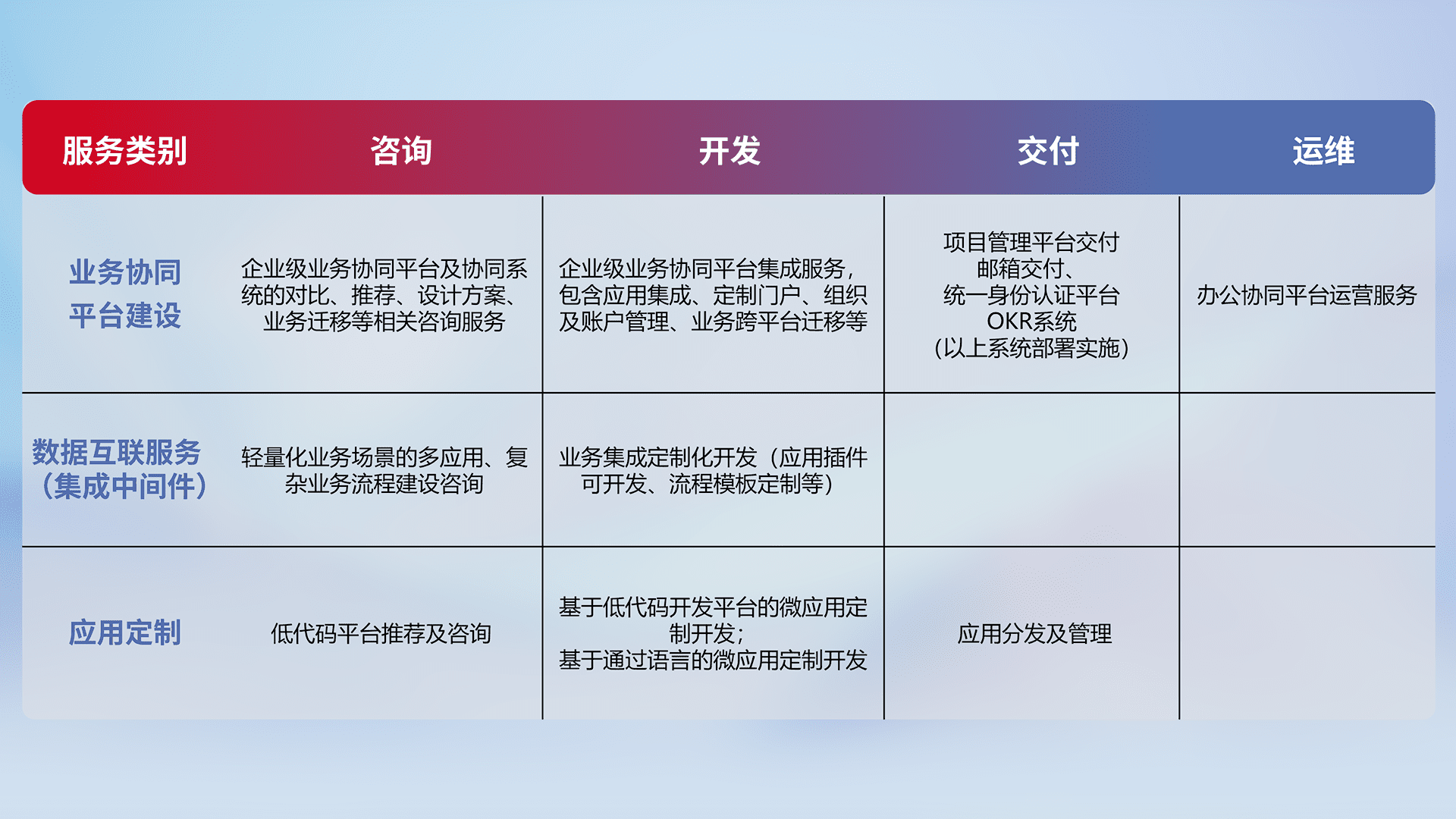 针对钉钉、、、企微、、、、IDaas等平台级产品提供产品的规划、、方案、、交付、、、定制化开发等服务,,,实现如统一协同办公、、、智能客户服务、、混合会议管理、、、、智能数据查询、、、、等业务场景,,,实现数字化转型。。。