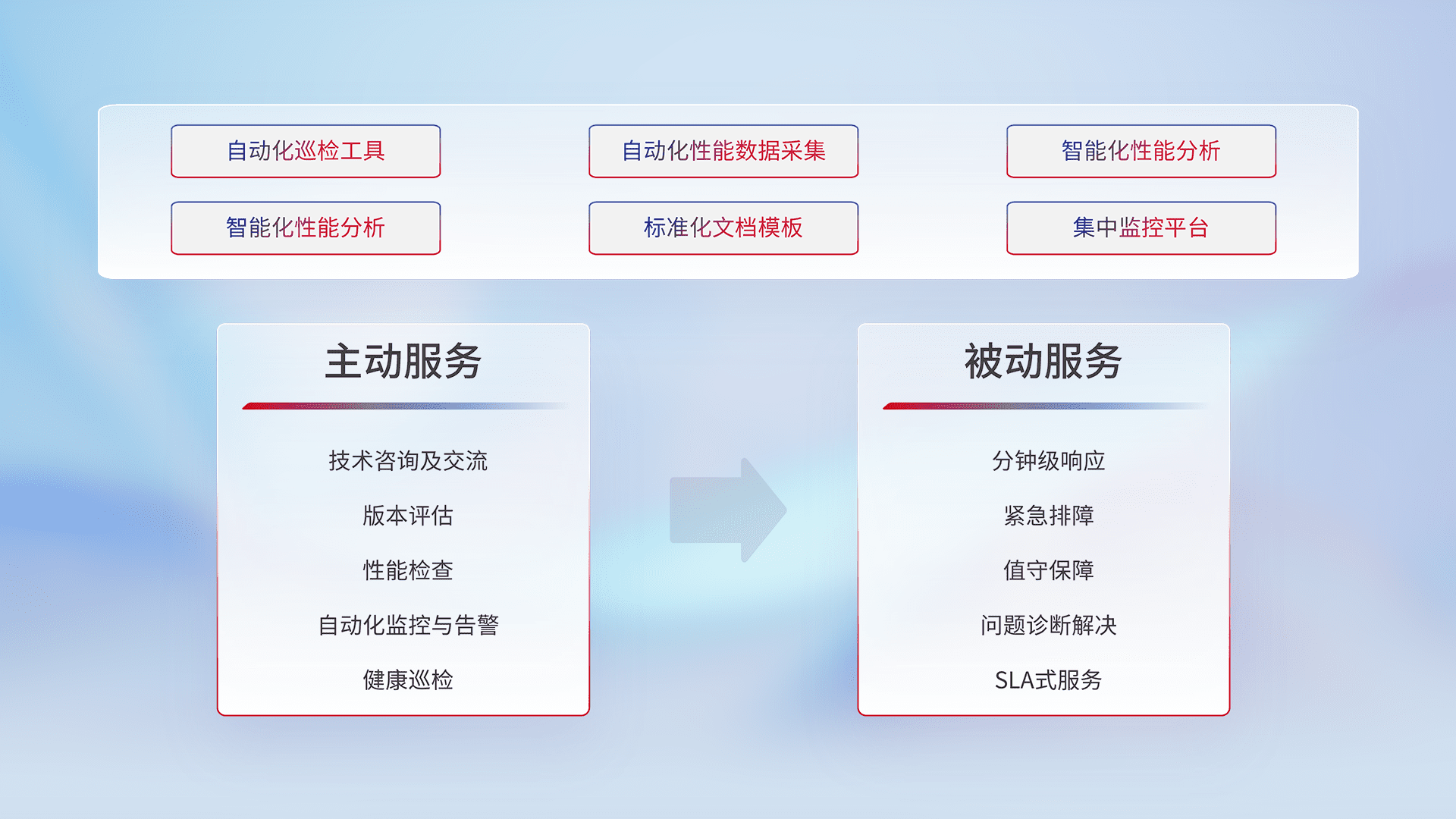 智能化工具和标准化文档,,,,保障服务质量,,,,提供主动服务(包含技术咨询、、版本评估、、、性能检查、、、、自动化监控与告警、、健康巡检)和被动服务包含(分钟级响应、、、紧急排障、、值守保障、、、、问题诊断解决、、、、SLA服务)。。